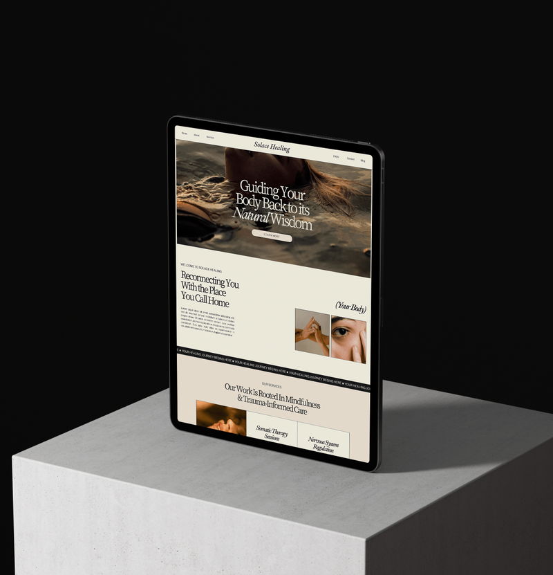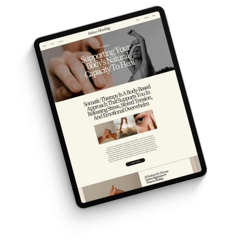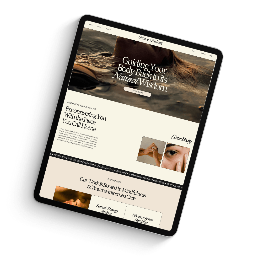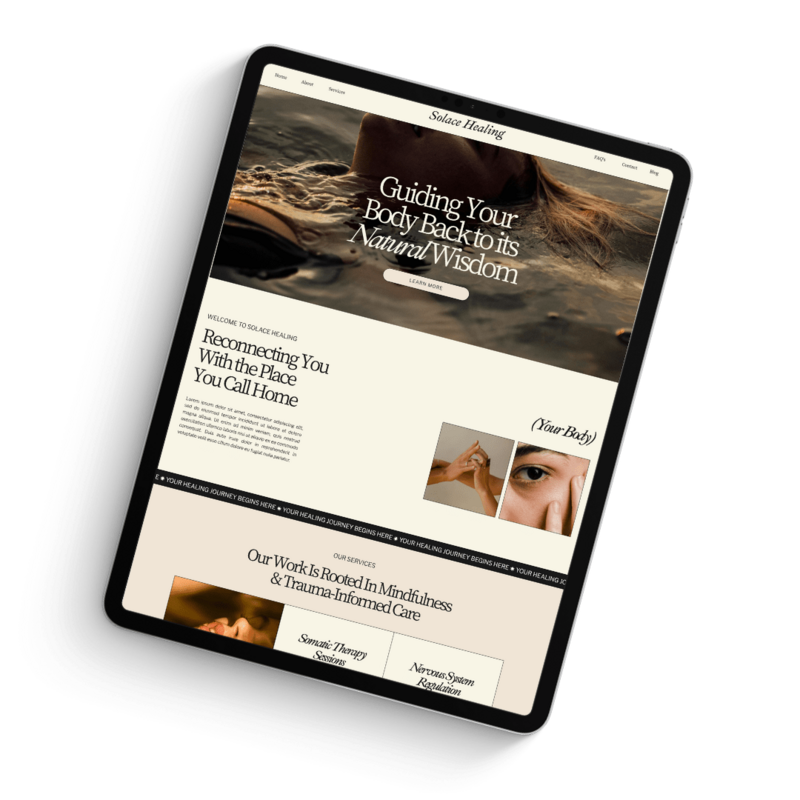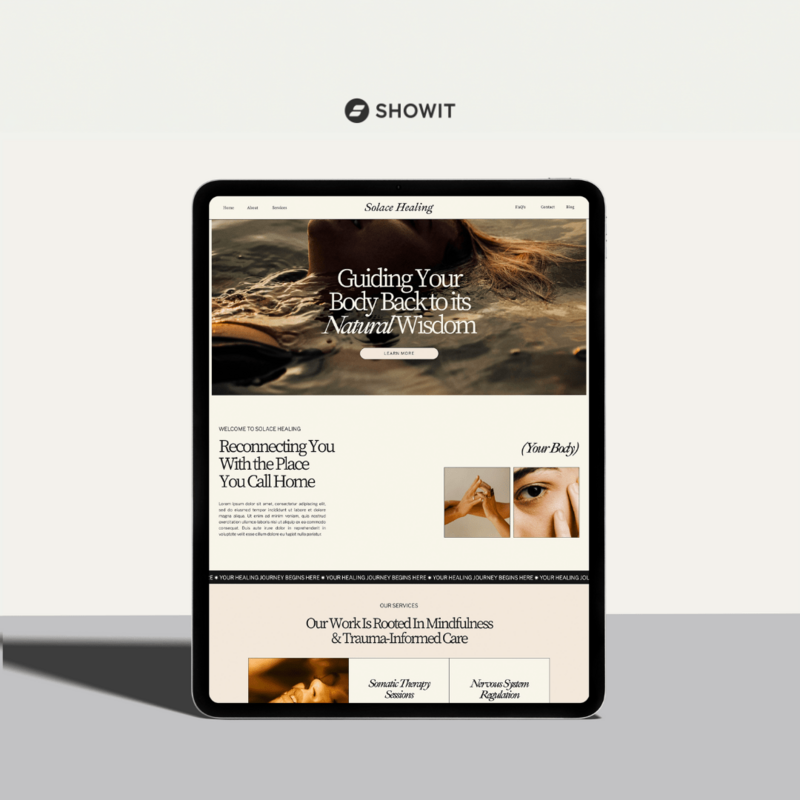 This Showit website template is designed for therapists, coaches, and healers who lead with intention. Grounded in minimal elegance and gentle movement, this design blends warmth, trust, and clarity, creating an experience that feels both nurturing and professional. Solace Healing Showit template helps you connect deeply, showcase your services with ease, and invite clients into a space that feels safe, grounded, and transformative.